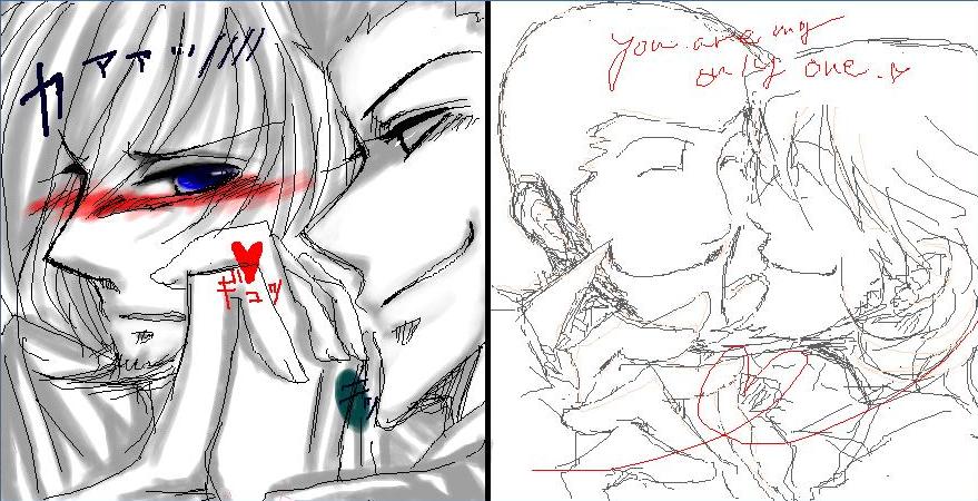 画面サイズの関係と(ワタシが古いノートPCで画面が小さいwwwので、あんまりキャンバスが大きいと描きにくくて…)『他の方のお絵かき過程が見たい!!』という澪さんの要望もあり、二人がお絵かき、一人が視姦(←)ということになりましたv